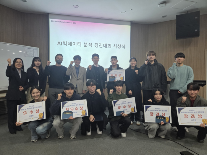 AI·빅데이터 분석 경진대회에서는 ▲조휘연·권용진 팀(최우수상), ▲김소정·최윤형 팀, ▲김성민·양진우·임대윤·장홍서 팀(우수상), ▲조휘연·신선경 팀, ▲김승현·김성민·류승민·장홍서 팀, ▲황경하 팀(장려상)이 선정됐다. 수상팀은 질병 예측, 주행 패턴 분석, 발전량 예측, 농업인 손상 위험 예측 등 다양한 사회 문제를 주제로 머신러닝·딥러닝 기반 분석을 수행해 높은 평가를 받았다.