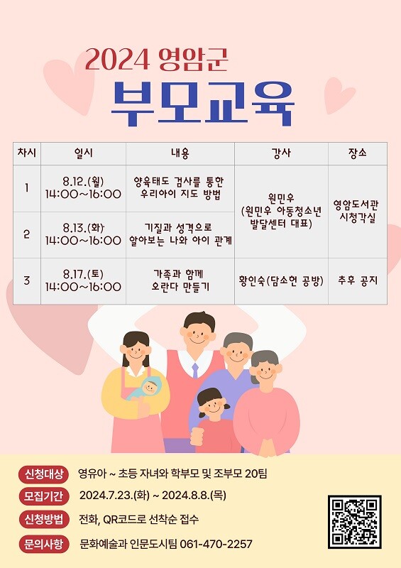 교육 신청은 8월 8일까지 전화와 QR코드로 신청할 수 있고, 자세한 안내는 영암군 인문도시팀으로 문의하면 된다.