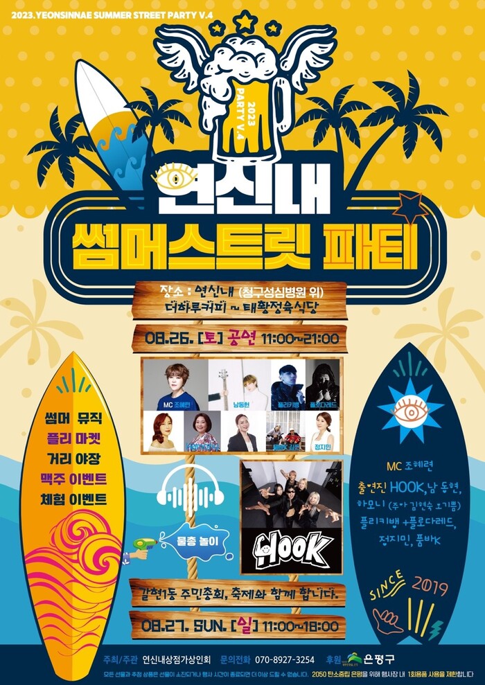 이번 연신내 썸머스트릿 파티는 ▲맥주 이벤트 부스 ▲핫썸머! 뮤직 공연무대 ▲거리야장 먹거리 부스 ▲플리마켓 부스 ▲물총놀이 게임 체험 부스 ▲경품 이벤트 ▲포토존 운영 등 여름의 끝자락을 즐길 수 있는 다양한 문화 콘텐츠와 체험 이벤트가 준비된다.