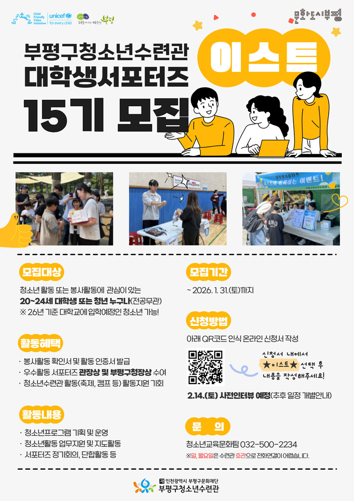 [인천=문찬식 기자] 인천 부평구 청소년수련관이 오는 31일까지 지역 내 청소년들을 위해 활동할 대학생 서포터즈 ‘이스트’ 10기 신규단원을 모집한다.