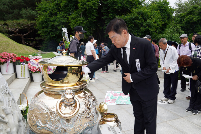 | ▲ 이필형 동대문구청장이 현충일인 6월 6일 박정희 대통령의 묘역을 찾아 참배하고 있다. (사진=동대문구청 제공) |