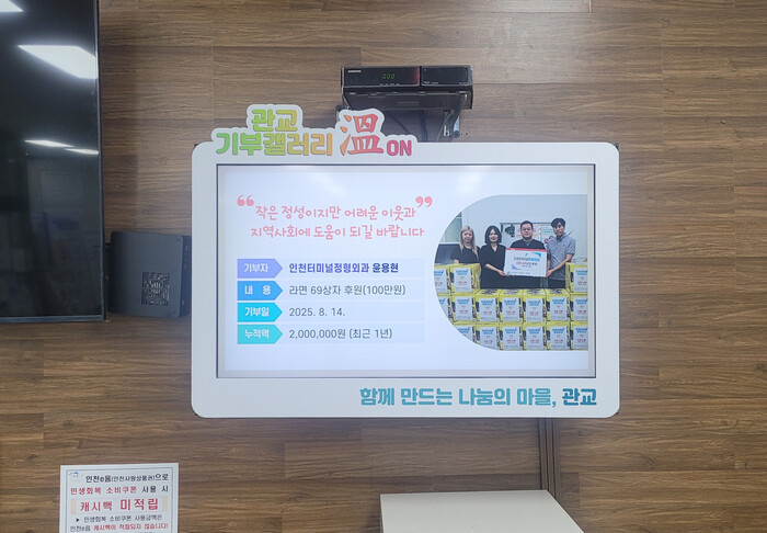[인천=문찬식 기자] 인천 미추홀구 관교동(동장 김은영)은 21일부터 지역 복지 활성화를 위한 ‘관교 기부 갤러리 溫(온, ON)’을 운영한다.