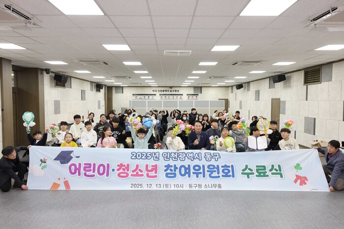 [인천=문찬식 기자] 인천 동구(구청장 김찬진)는 지난 13일 구청 소나무홀에서 ‘2025년 어린이·청소년 참여위원회’ 수료식을 개최했다고 밝혔다.