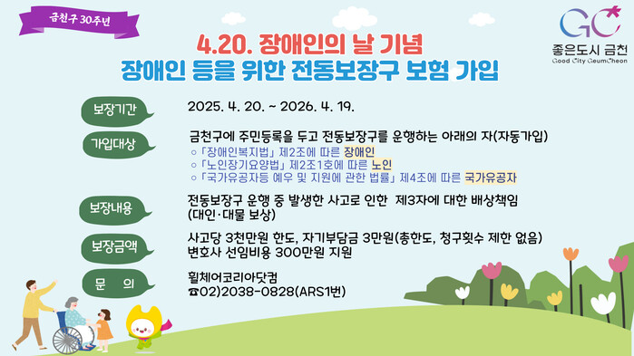 [시민일보 = 여영준 기자] 금천구(구청장 유성훈)는 전동보장구를 이용하는 장애인, 노인, 국가유공자를 대상으로 ‘전동보장구 안심보험’에 가입했다고 밝혔다.