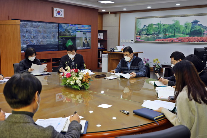 경기 수원시 권선구는 이귀만 제30대 신임구청장 취임에 따라 구정 주요업무 보고회를 5~7일 부서별 순차적으로 진행하고 있다. 보고회는 세류3동 행정복지센터 신축 등 올해 부서별로 추진할 신규사업 등 핵심사업 위주로 이뤄진다. 사진은 이 구청장(왼쪽 세 번째)과 관계자들이 보고회를 진행하고 있는 모습. (사진제공=권선구청)