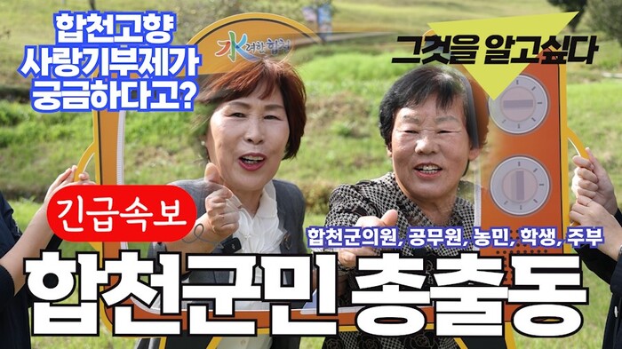 홍보영상 2탄은 ‘합천군민 총출동’이라는 문구를 시작으로 언니(배순연 쌍책면 매호이장)와 여동생(김남숙 쌍책면 창동이장) 아나운서가 등장해 “본인이 살고 있는 주소지에 고향사랑기부가 가능한지”에 대한 대화로 시작한다. 기획예산담당관이 이에 대한 답을 알려주며 고향사랑기부제를 재치있게 홍보한다. 정답은 영상을 통해 확인할 수 있다.