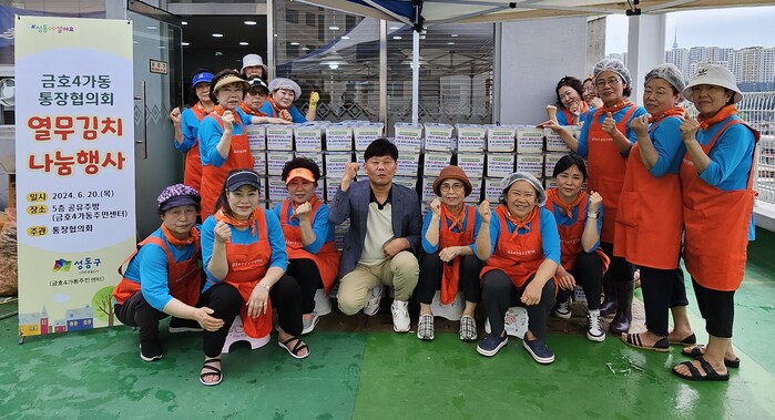 [시민일보 = 이대우 기자] 서울 성동구 금호4가동은 최근 주민센터 공유주방에서 통장협의회 주관으로 사랑의 열무김치 나눔 행사를 진행했다.