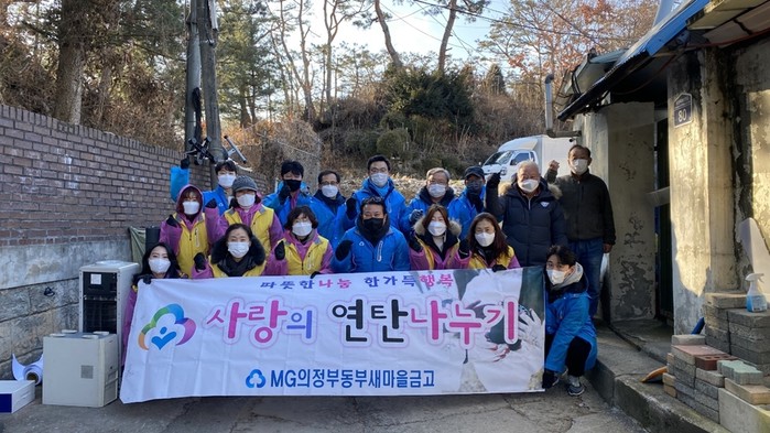 경기 의정부시 동부새마을금고는 최근 송산1동 빼벌마을에 거주하는 난방취약계층에 연탄 4000장을 기탁했으며, 새마을금고 직원 등이 직접 참여해 연탄 배달 봉사에 참여했다. 사진은 이날 참여한 직원들이 기념촬영을 하는 모습. (사진제공=의정부시청)