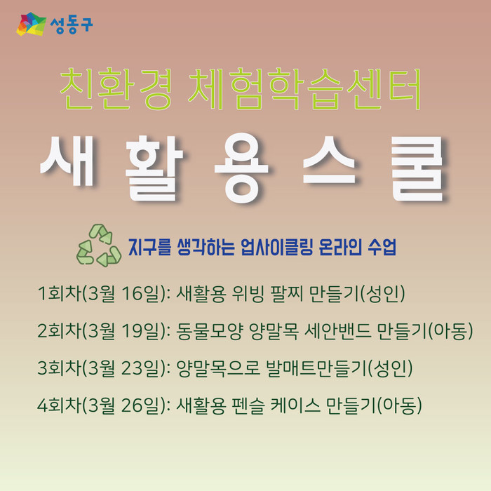 [시민일보 = 홍덕표 기자] 서울 성동구(구청장 정원오) 친환경산업체험학습센터에서는 이달부터 오는 11월까지 '새활용스쿨'을 운영한다.