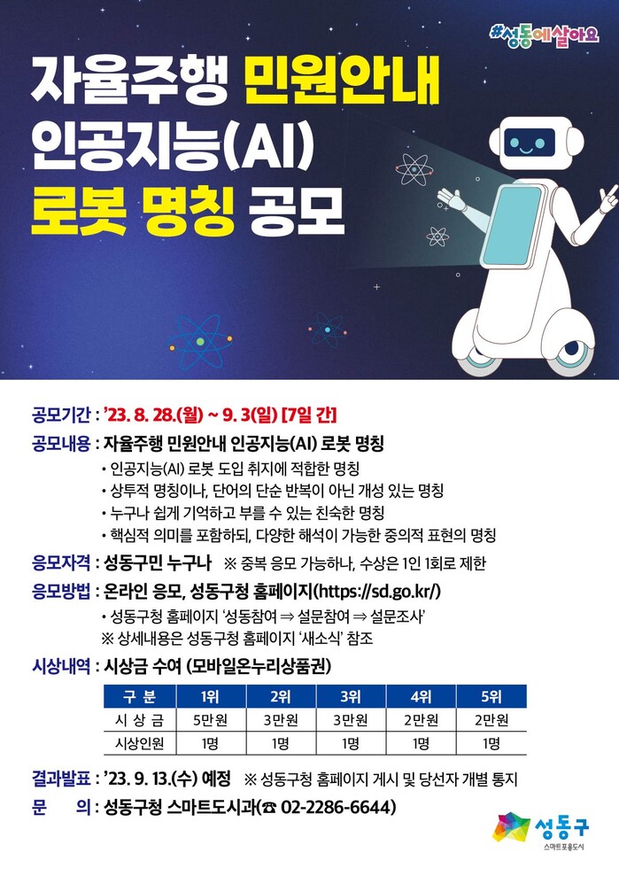 [시민일보 = 홍덕표 기자] 서울 성동구(구청장 정원오)가 구청사 1층에 도입 예정인 '자율주행 민원안내 AI로봇'의 명칭 공모전을 개최한다.