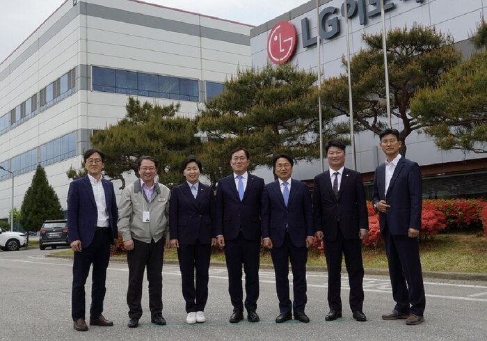 | ▲ 강기정 광주광역시장이 28일 LG이노텍 광주사업장을 방문한 뒤 기념촬영하고 있다. 사진 왼쪽부터 조백수 LG이노텍 경영지원담당(상무), 유병국 LG이노텍 전장부품사업부장(상무), 양향자 국회의원, 정철동 LG이노텍 대표이사, 강기정 광주광역시장, 박창환 전라남도 정무부지사, 배운교 LG이노텍 전장부품생산담당(상무) |