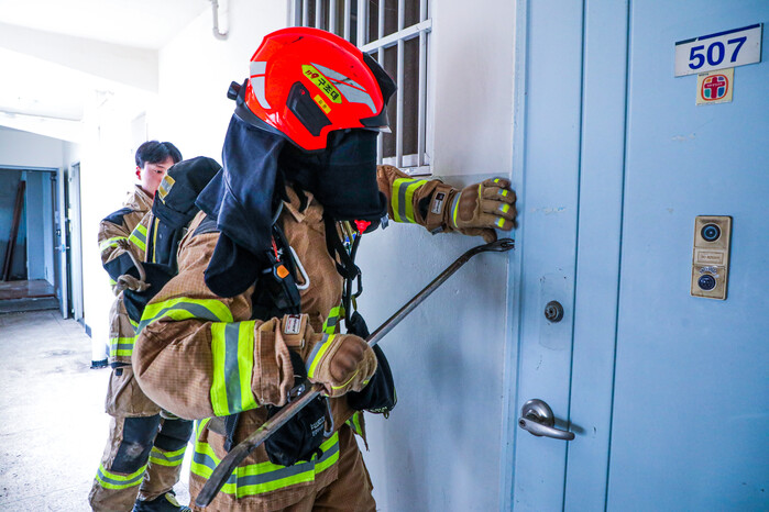 이번 훈련은 강제개방이 어려운 벽 밀착형 방화문과 협소공간 출입문에 대한 신속 개방 능력을 향상하는 데 중점을 두었다.