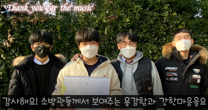 동영상에는 양산중학교 2학년 6반 학생들이 “Thank you for the music” 노래를 직접 부르며 소방관의 희생과 노고에 감사의 마음이 담긴 메시지가 담겨있었다.