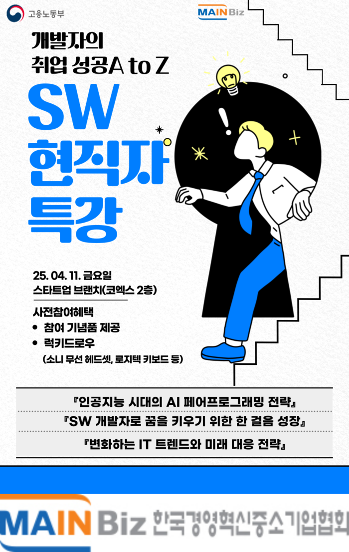 고용노동부가 주최하고 (사)한국경영혁신중소기업협회(이하 메인비즈 협회, 회장 김명진)가 주관하는 ‘2025년 SW 잡코칭-DAY’가 오는 4월 11일(금) 코엑스 스타트업 브랜치에서 열린다.