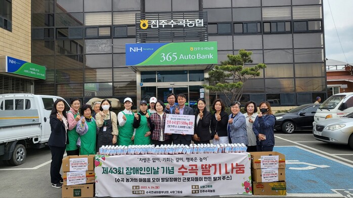 본 행사를 주최한 수곡면새마을부녀회 하윤숙 회장은 “제43회 장애인의 날을 맞이하여 부녀회 회원 및 주민들과 뜻깊은 봉사를 진행할 수 있어 기쁘다”며 “이번 수곡 딸기주스 나눔 행사가 수곡 특산품인 품질 좋은 딸기를 관내 사회복지시설과 나누는 자리에 함께 동참해 준 진주수곡농협과 사랑그림숲에 감사를 전한다”고 말했다.