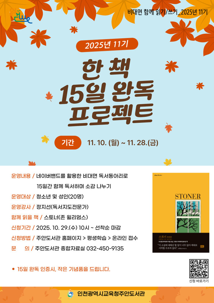 [인천=문찬식 기자] 인천광역시교육청주안도서관(관장 최문정)은 10월 29일(수) 오전 10시부터 ‘2025년 11기 비대면 함께 읽기–한 책 15일 완독 프로젝트’ 참가자를 모집한다.