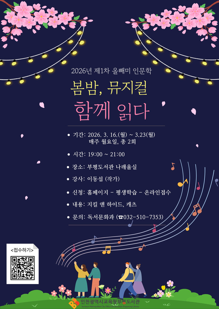 [인천=문찬식 기자] 인천광역시교육청부평도서관(관장 김재영)은 5일부터 2026년 제1차 올빼미 인문학 강연 ‘봄밤, 뮤지컬 함께 읽다’ 참여자를 모집한다.