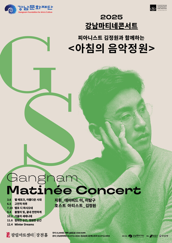 3.6(목)에 있을 첫 번째 공연은 프랑스 예술과 음악이 꽃피던 황금기를 의미하는 ‘벨 에포크(Belle Époque)’라는 단어로 꾸며진다. 프랑스 인상주의 음악의 색채와 문학적 감성을 담아낸 포레, 드뷔시, 라벨, 비제 등의 곡들과 함께 2025년 새로운 <강남마티네콘서트>가 ‘아름다운 시대’를 연다는 뜻을 내포하고 있다. 진중하면서도 밀도감 있는 해석이 돋보이는 데이비드 이 예술감독의 지휘와 강남심포니오케스트라의 섬세한 연주가 피아니스트 김정원의 따뜻하면서도 깊이 있는 해설과 조우하며 관객들에게 ‘벨 에포크’ 시기의 프랑스 음악의 묘미를 전할 예정이다.