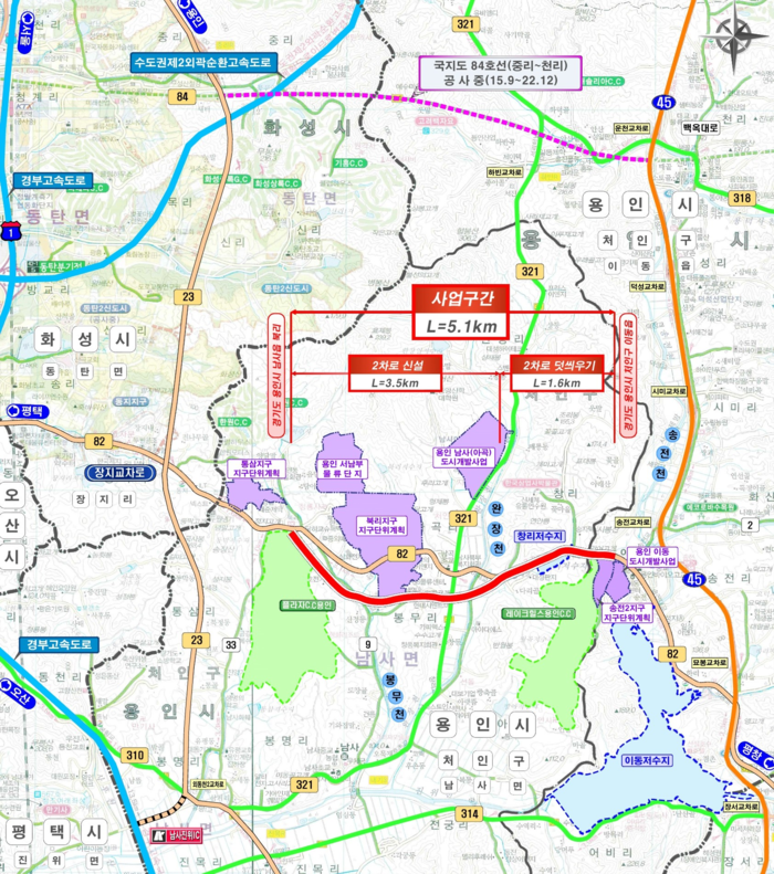 용인 장지-남사 국가지원지방도 도로건설공사는 용인시 처인구 남사읍 북리에서부터 이동읍 송전리까지 총 5.1㎞ 구간에 2차로 신설(3.5㎞) 및 2차로 덧씌우기(1.6㎞)를 추진하는 사업으로 총사업비 789억원이 투입될 예정이다.