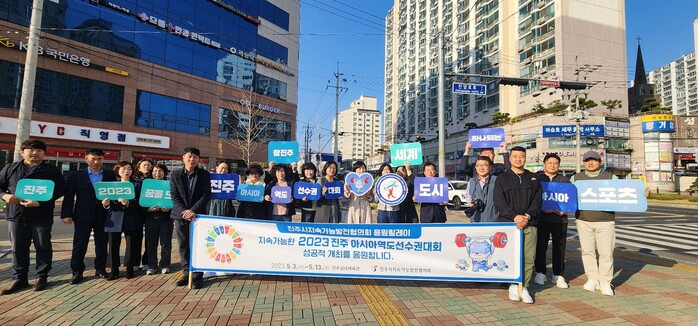 [진주=엄기동 기자] 진주시지속가능발전협의회(회장 민현주)는 3일 평거 10호광장 사거리에서 ‘2023 진주아시아역도선수권대회’가 지속가능한 친환경 대회로 성공적인 개최를 바라며 진주시민들과 함께 ‘릴레이 응원 캠페인’을 실시했다.