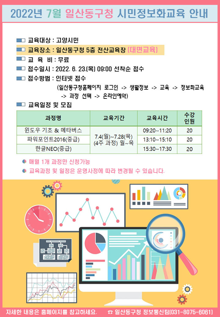 [고양=이기홍 기자] 고양시 일산동구는 오는 23일부터 시민정보화교육 7월 과정 수강생을 선착순 모집한다.
