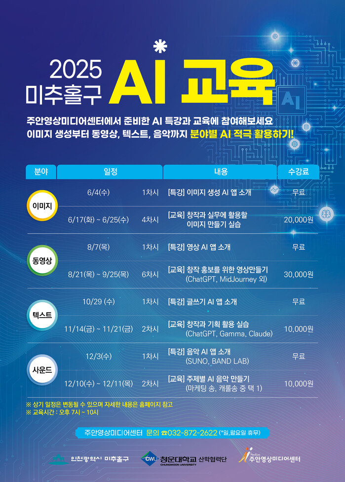 [인천=문찬식 기자] 인천 미추홀구(구청장 이영훈) 주안영상미디어센터(센터장 장구보, 이하 센터)는 오는 6월부터 ‘분야별 인공지능(AI) 활용 교육’을 운영한다.
