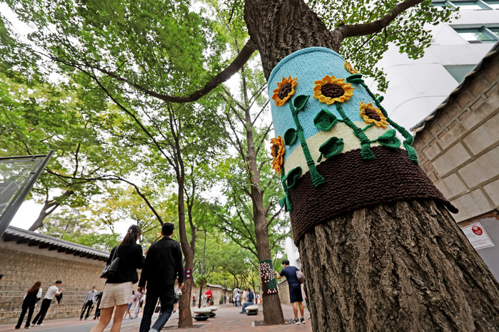 가을에 접어든 2일 오후 서울 중구 덕수궁 돌담길에 심어진 나무에 손뜨개 옷이 입혀져 있다.