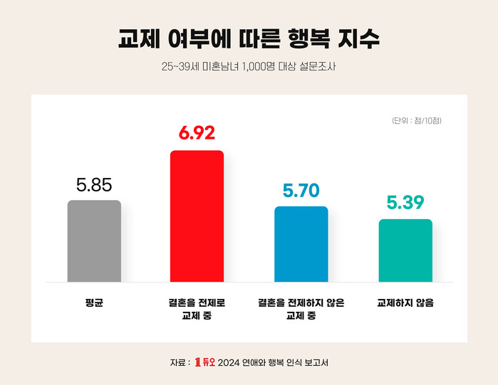 한국 2030 미혼남녀의 평균 행복지수는 10점 만점에 5.85점, 2024년 행복 기대 지수는 6.21점이었다. 현재의 만족을 나타내는 행복지수보다 앞으로의 기대 지수가 0.36점 더 높았다.