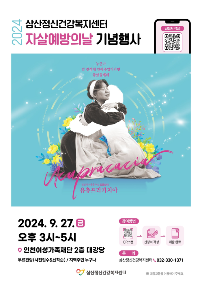 [인천=문찬식 기자] 인천 부평구(구청장 차준택) 삼산정신건강복지센터는 ‘자살예방의 날’을 기념해 오는 9월27일 인천여성가족재단 대강당에서 생명사랑 연극 ‘유츄프라카치아’를 진행한다.