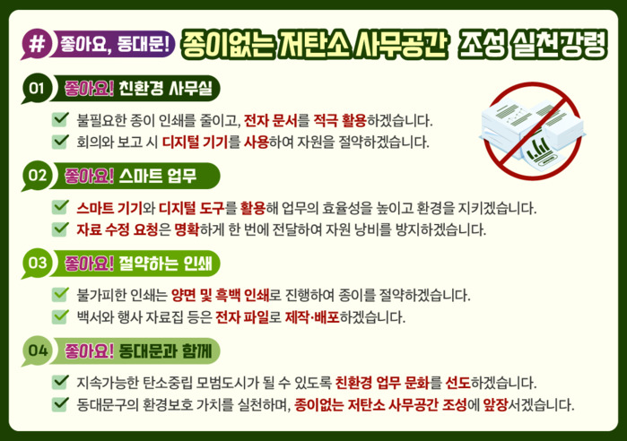 이필형 구청장은 “종이 절약부터 에코백 기부까지, 직원들의 자발적인 실천이 동대문구의 탄소중립 문화를 이끌고 있다”며, “앞으로도 전 부서가 디지털 전환과 자원순환 실천에 앞장서고, 구민과 함께 지속가능한 탄소중립 도시를 만들어가겠다”고 밝혔다.