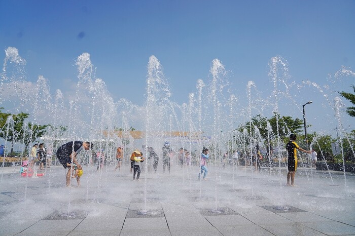 | ▲ 해남군이 지난 5일부터 고천암 바닥분수를 가동하고 있는 가운데 이곳을 찾은 어린이들이 솓구치는 물줄기를 즐기고 있다. / 해남군 제공 |