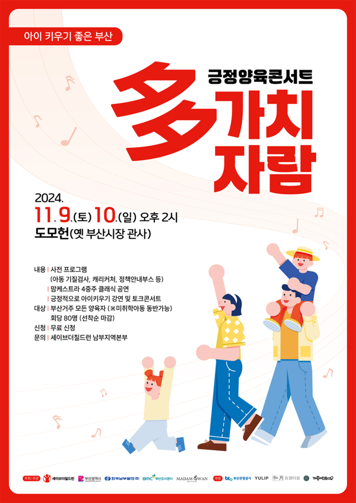 세이브더칠드런은 옛 부산시장 관사였던 도모헌에서 11월 9일(토)부터 10일(일)까지 양일간 오후 2시에 ‘아이 키우기 좋은 부산, 긍정 양육 콘서트 : 多가치 자람’ 행사를 개최한다고 밝혔다.