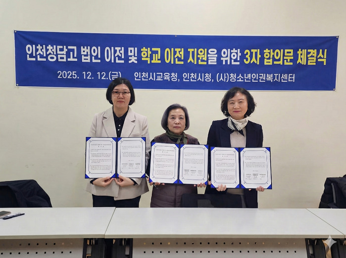 [인천=문찬식 기자] 인천광역시교육청(교육감 도성훈)은 지난 12일 인천시청, 사단법인 청소년인권복지센터 내일과 함께 인천청담고등학교의 법인 이전 및 학교 이전 지원을 위한 3자 합의를 체결했다.