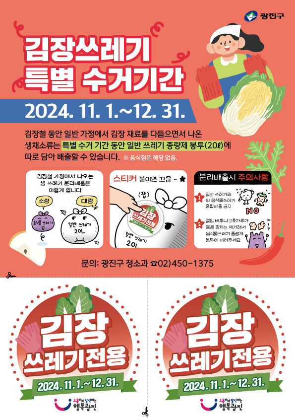 [시민일보 = 여영준 기자] 광진구(구청장 김경호)가 11~12월 두 달간 김장 쓰레기 일반 종량제봉투 배출을 허용하는 특별 수거 기간을 운영한다.