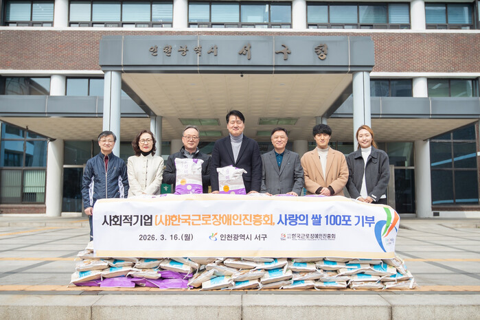 [인천=문찬식 기자] 인천 서구(구청장 강범석)는 지난 16일 지역 내 사회적기업인 ㈔한국근로장애인진흥회(대표 윤기상)로부터 사랑의 쌀(10kg) 100포를 기탁받았다고 밝혔다. 기탁된 쌀은 관내 취약계층 가구에 전달될 예정이다.