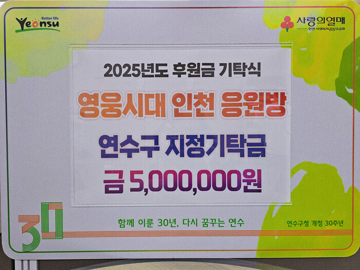 연수구 관계자는 “지역사회에 따뜻한 관심을 전해준 ‘영웅시대 인천 응원방’ 회원분들에게 감사하다.”라며 “기탁된 후원금은 경제적 어려움을 겪는 가정이 따뜻한 겨울을 보낼 수 있도록 소중히 사용하겠다.”라고 말했다.