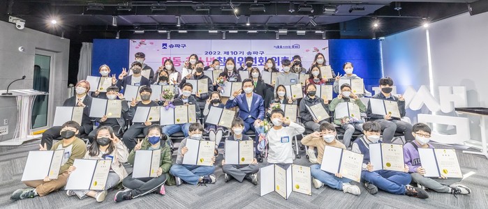 서울 송파구는 지난 1일 아동·청소년의 정책 참여와 권익 증진을 위해 ‘2022년 송파구 아동·청소년 참여위원회’ 위원 63명을 위촉했다. 위원회는 구에 거주하거나, 학교밖 청소년을 포함한 지역내 초·중·고·대학생 9~24세 위원으로 구성됐다. 사진은 위촉식에서 박성수 구청장(둘째줄 가운데)과 신규 위원들이 기념촬영을 하는 모습. (사진제공=송파구청)