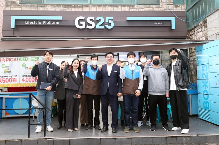 | ▲ 박일하 구청장(가운데)이 편의점사업단을 방문해 참여자를 격려하고 있다. (사진=동작구청 제공) |