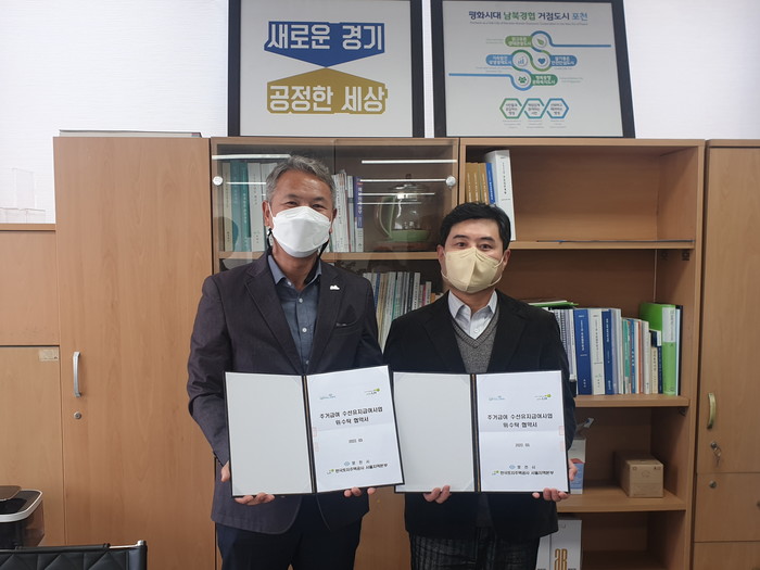 경기 포천시는 최근 저소득층 주거환경 개선을 위해 한국토지주택공사 서울지역본부와 2022년 수선유지 급여사업 위·수탁 협약을 체결했다. 협약으로 시는 주택 수선 사업비를 부담하고, LH 서울지역본부는 사업 전반에 관한 업무를 수행하기로 했다. 사진은 협약식에서 관계자들이 기념촬영을 하는 모습. (사진제공=포천시청)