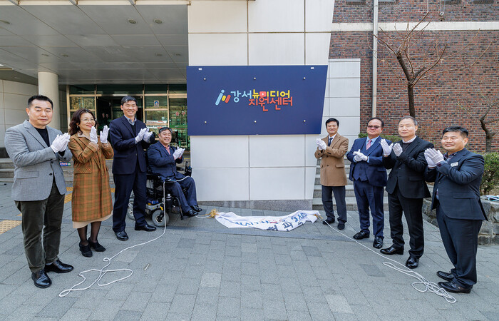 김태우 서울 강서구청장이 20일 사회적 약자를 위한 전문 콘텐츠 생산, 유튜브 채널 운영 등을 지원하는 ‘강서뉴미디어지원센터’ 현판식을 열고 ‘강서동행’ 프로젝트의 본격 시동을 걸었다. 사진은 김 구청장(가운데 오른쪽)과 관계자들이 제막식을 마친 후 기념촬영을 하고 있는 모습. (사진=강서구청 제공)