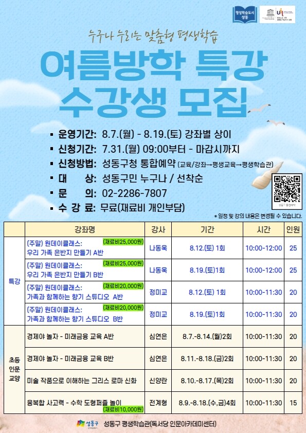 | ▲ 성동구 평생학습관 여름방학 특강 프로그램 수강생 모집 안내문. (사진=성동구청 제공) |