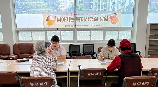 ‘찾아가는 복지상담실’은 매월 1회 마을별로 주민이 많이 모이는 장소에 찾아가 다양한 복지서비스를 알리고, 주민들이 필요로 하는 복지정책 등에 대한 목소리를 듣고 도움을 주기위해 운영하는 주민밀착형 사업으로, 개별적으로 맞춤형 상담을 진행하여 다양한 복지 서비스를 지원 ·연계하고 있다.