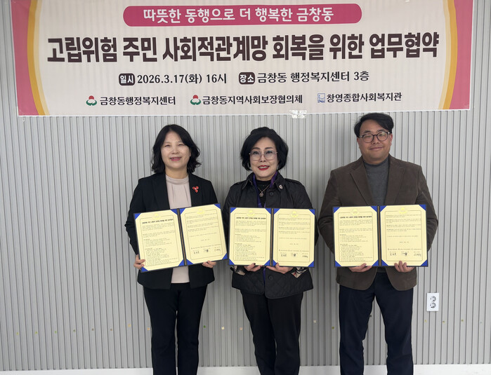 [인천=문찬식 기자] 인천 동구 금창동(동장 김순옥)과 금창동 지역사회보장협의체(민간위원장 조수형), 창영사회종합복지관(관장 오병규)은 지난 17일 고립 위험 주민 안부 확인과 지역사회 돌봄체계 강화를 위한 업무협약(MOU)을 체결했다고 밝혔다.