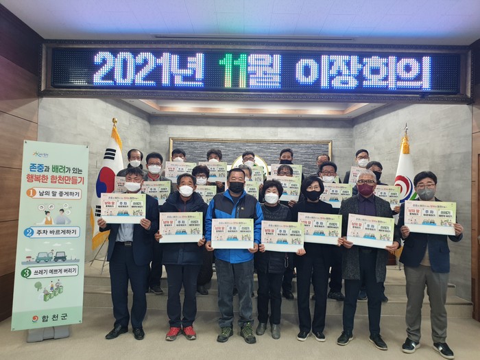 합천군 적중면(면장 오근희)은 23일 면사무소 2층 회의실에서 적중면 이장단 및 사회단체장이 참석한 가운데 11월 이장회의를 마친 후, 존중과 배려가 있는 행복한 합천 만들기 캠페인 챌린지에 동참했다.