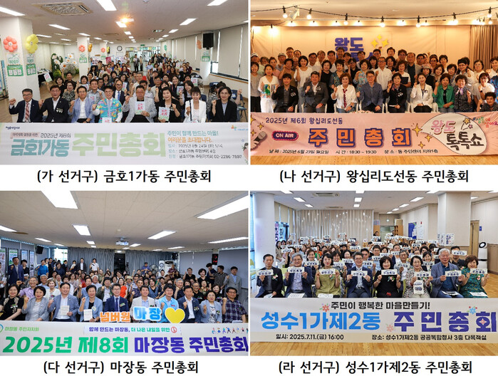 각 지역구 주민총회에 참석한 성동구의회 의원들은 “주민총회는 풀뿌리 민주주의의 실현을 위한 핵심적인 제도로 주민 여러분의 많은 관심과 참여를 부탁드린다”고 입을 모았다.