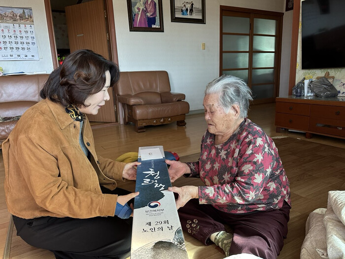 [인천=문찬식 기자] 인천 강화군 화도면(면장 조순이)은 지난 27일, 100세를 맞이하신 장화1리 정애인 어르신께 건강과 장수를 상징하는 장수 지팡이 ‘청려장(靑藜杖)’을 전했다고 밝혔다.