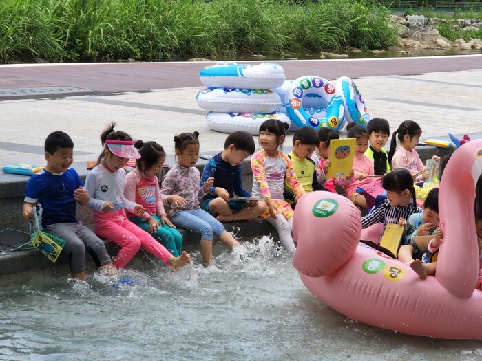 | ▲ 지난해 7월 열린 성내천 물놀이장 피서지문고에서 아이들이 체험활동과 독서를 즐기고 있다. (사진=송파구청 제공) |