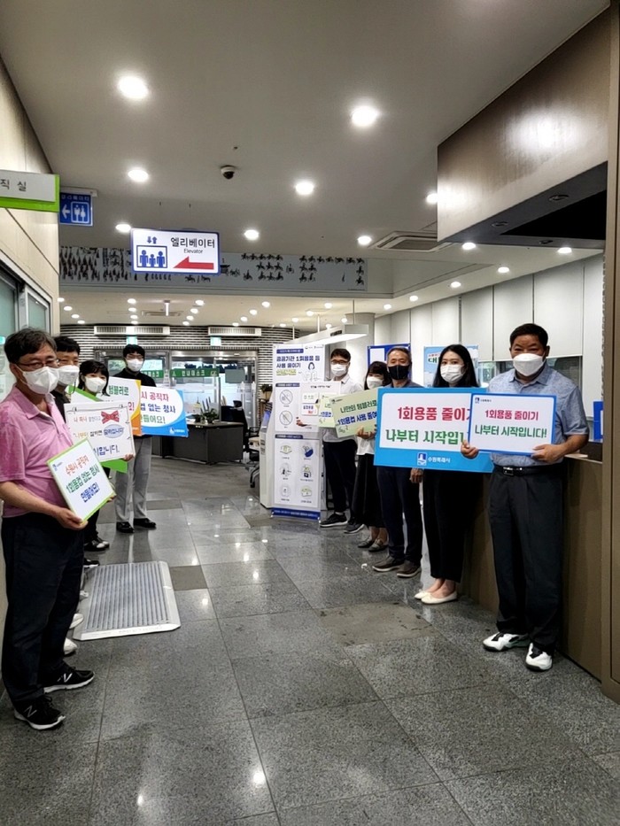 경기 수원시 팔달구는 최근 공직자들을 대상으로 '공공기관에서 선도적으로 1회용컵 사용 줄이기 및 다회용컵 사용에 대한 캠페인'을 전개했다. 캠페인에서는 ‘일회용품 없는 청사 만들기’ 등 문구가 적힌 홍보 피켓을 통해 '청사내 다회용컵 사용을 통한 환경 보호에 동참해달라'고 독려했다. 사진은 이날 캠페인이 진행되고 있는 모습. (사진제공=팔달구청)