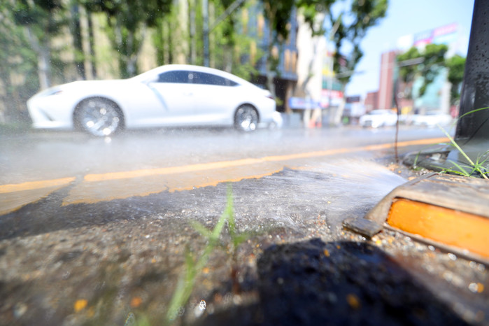대구·경북 대부분 지역에 낮 최고 기온이 33도를 웃돌며 폭염특보가 내려진 21일 대구 달구벌대로에 설치된 클린 로드 시스템에서 도로 열기를 식히는 물이 뿜어져 나오고 있다. 클린 로드는 지하철에서 유출돼 버려지는 깨끗한 지하수를 활용해 열섬현상 저감 등을 위해 대구시설관리공단에서 운영하는 시스템이다.
