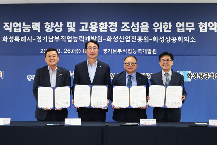 이날 경기남부직업능력개발원에서 열린 협약식에서 정명근 화성특례시장과 장동수 경기남부직업능력개발원장, 안상교 화성상공회의소회장, 전병선 화성산업진흥원장은 협약을 체결한 뒤, 함께 융복합종합실습관·청각특화다목적실 등 직업 훈련 현장을 직접 견학했다.